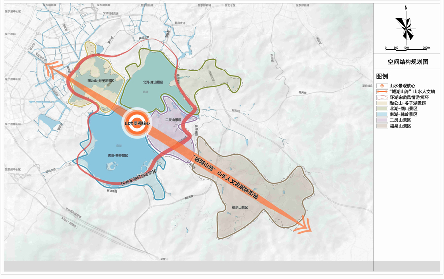 景区整体构建“一核一轴、一环五区”空间结构。一核:东钱湖山水景观核心;一轴:“城湖山海”山水人文发展联系轴;一环:环湖宋韵风情游赏环;五区:陶公山-谷子湖、二灵山、南湖-韩岭、北湖-鹰山、福泉山五大子景区。